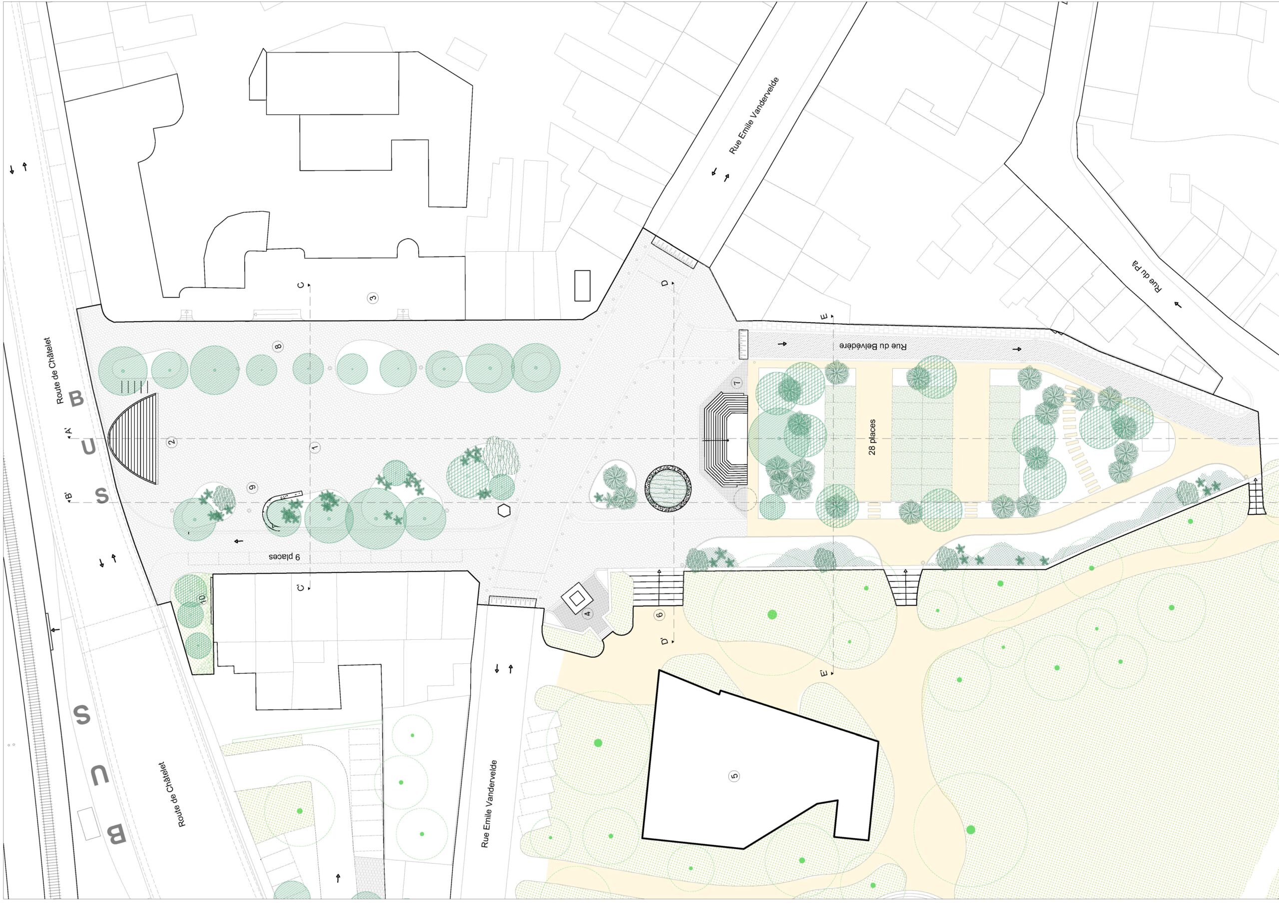 Finally, a major urban element the “gradin” is introduced along the Châtelet road. This stepped structure plays a double role. Towards the road, it acts as a protective buffer and integrates a bus stop, providing shelter and serving as a signal for the square. Towards the square and park, it becomes a large south-facing seating landscape: a place for daily rest, play, and informal gathering, as well as for concerts and public events. By reshaping the edge condition, the gradin redefines the limits of the square while opening it to new uses and perspectives.