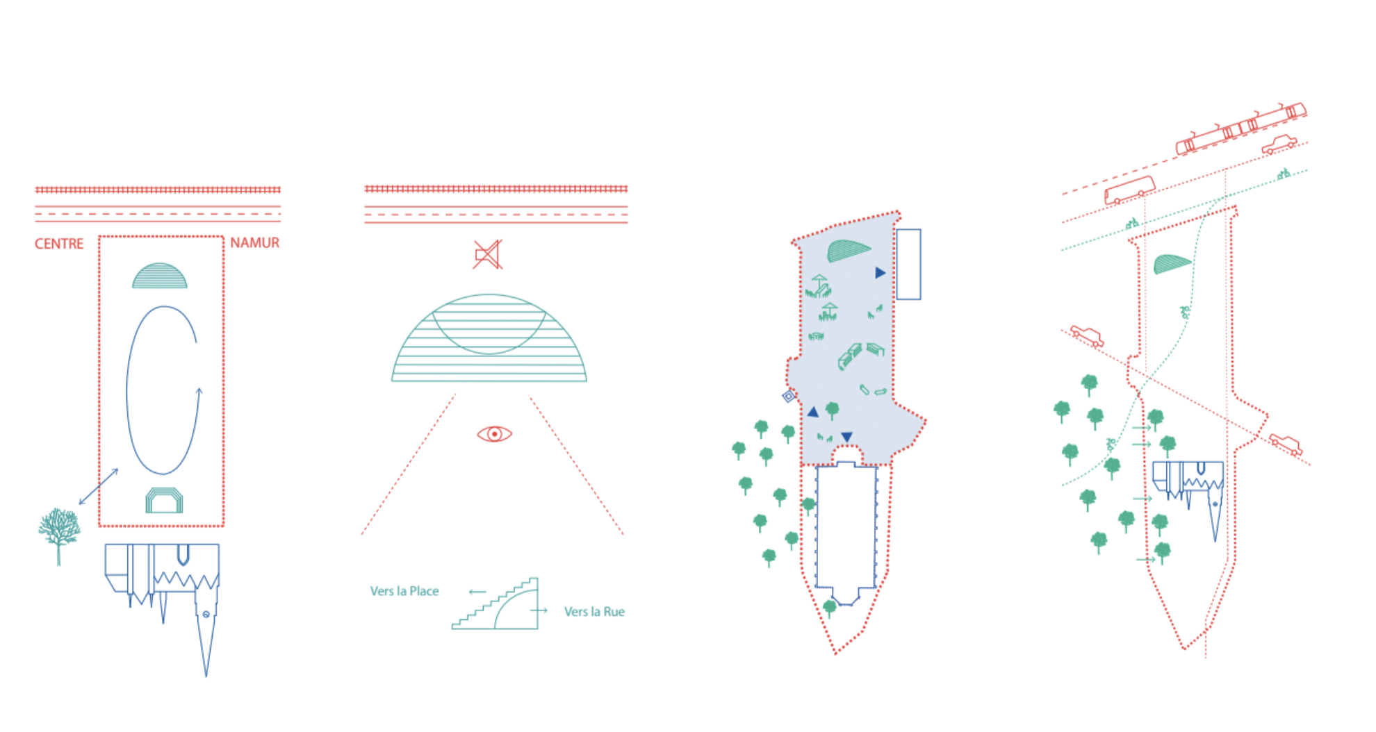 The proposal is built around several key principles: to valorize the square as a civic and historical center, to integrate the needs of all actors, to redefine the square as a continuous and coherent public space, to reconnect it with the wider network of open green spaces in the neighborhood, and to organize circulation flows in a balanced and sustainable way.