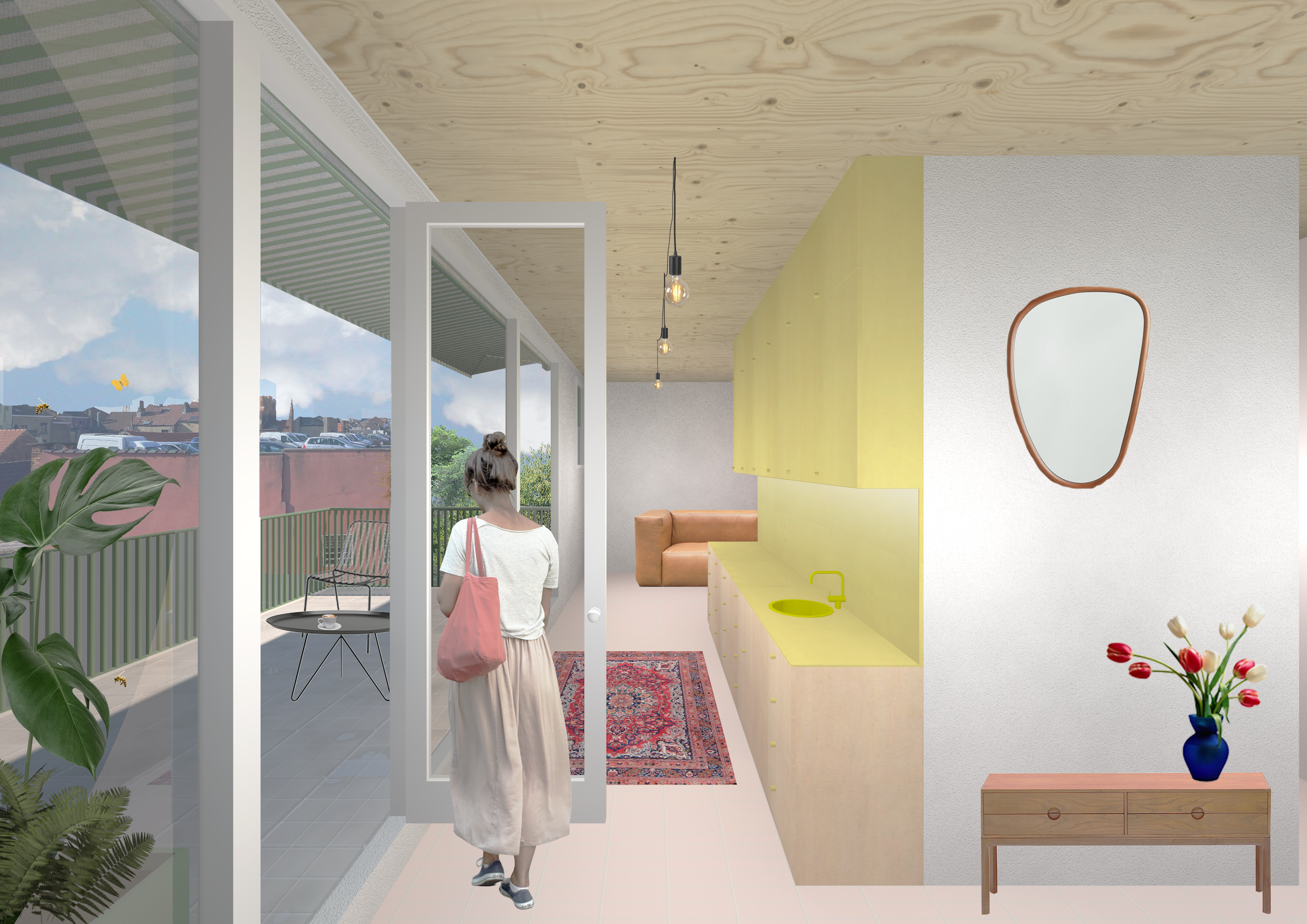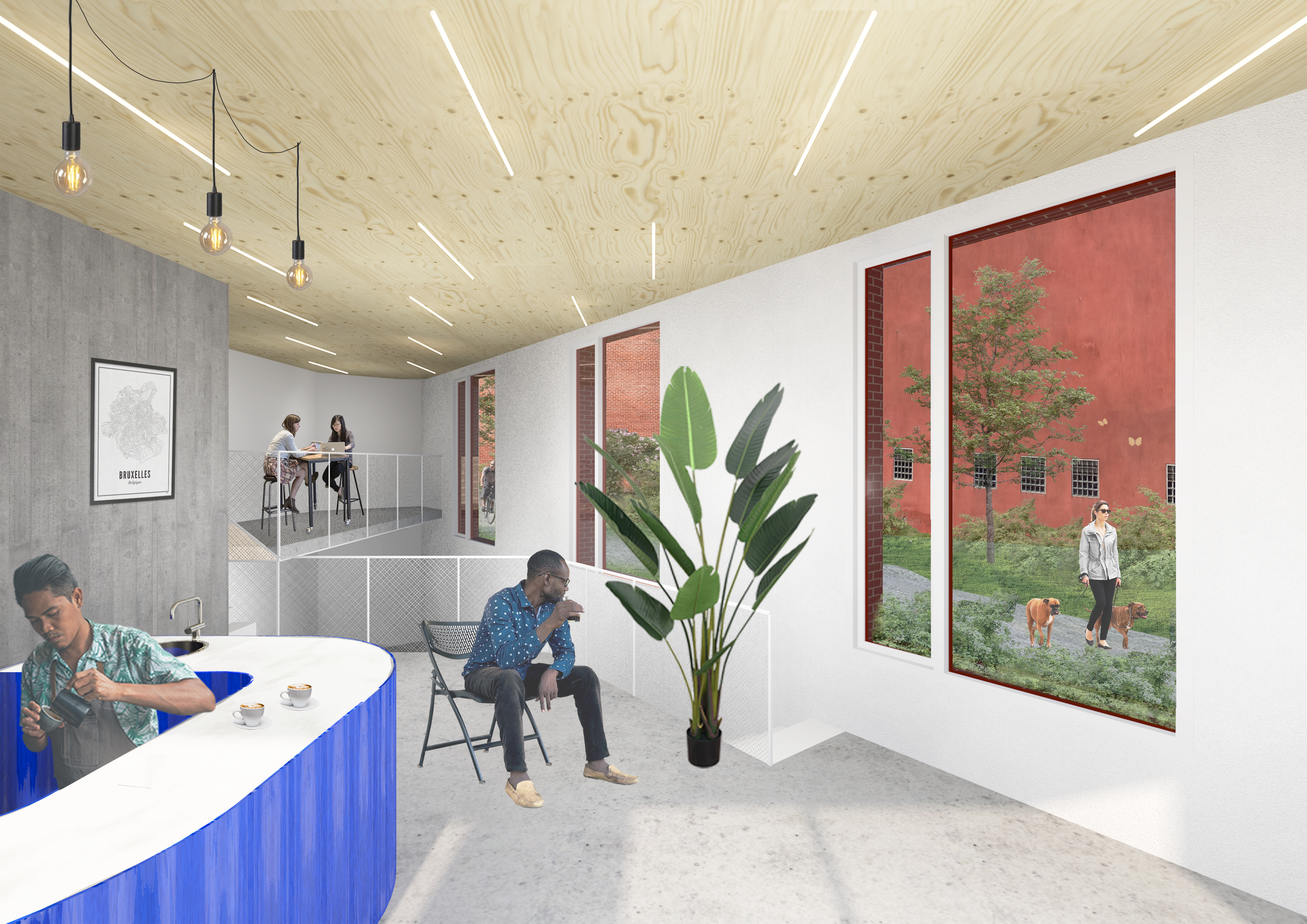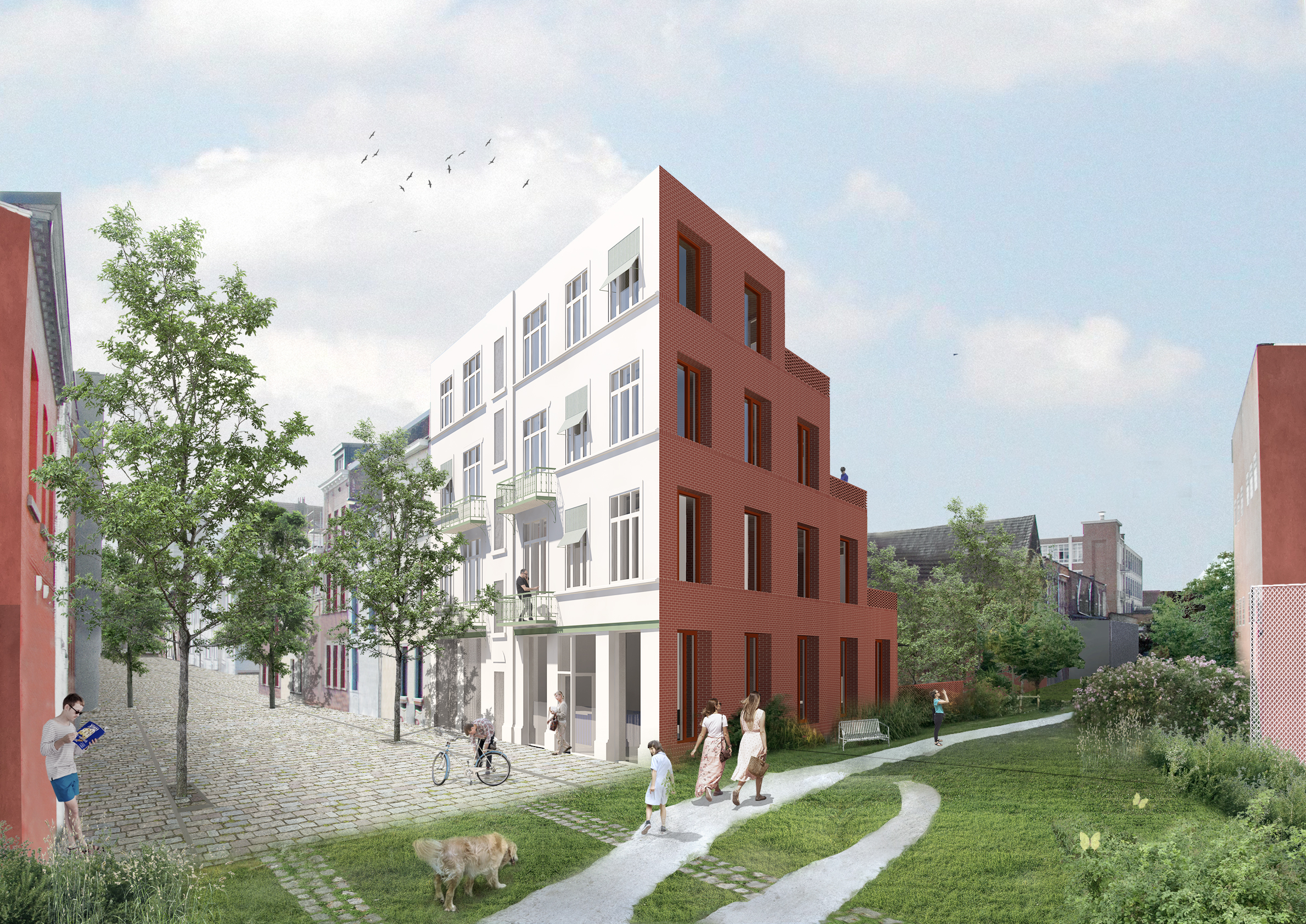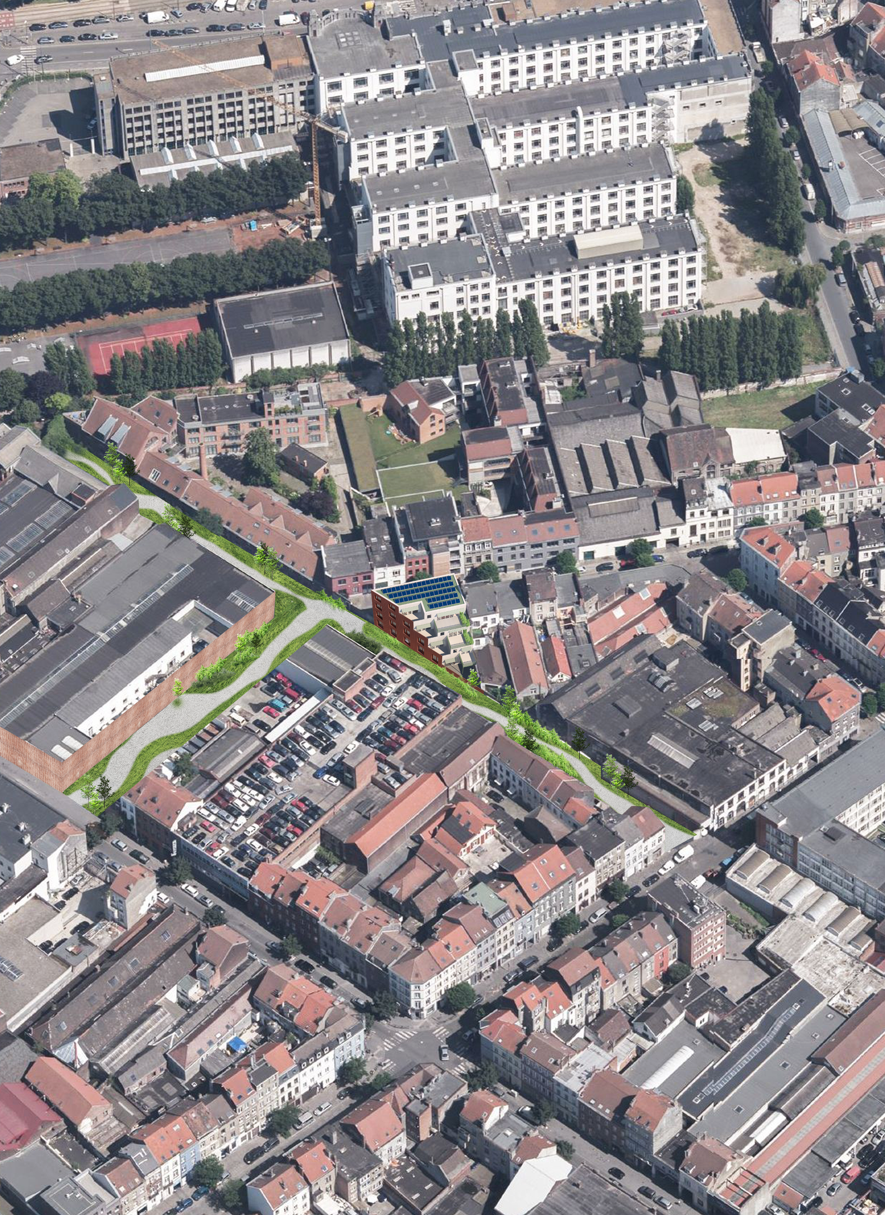 : Terrasse residentialThe project “Bougie 34–36” is located in the Heyvaert–Cureghem district of Anderlecht, at the junction between three municipalities and on the threshold of major urban transformations. Once dominated by the second-hand car trade and its nuisances, the neighborhood is now undergoing a profound shift through the Canal Plan, the PAD Heyvaert, and the Heyvaert–Poincaré Urban Renewal Contract.