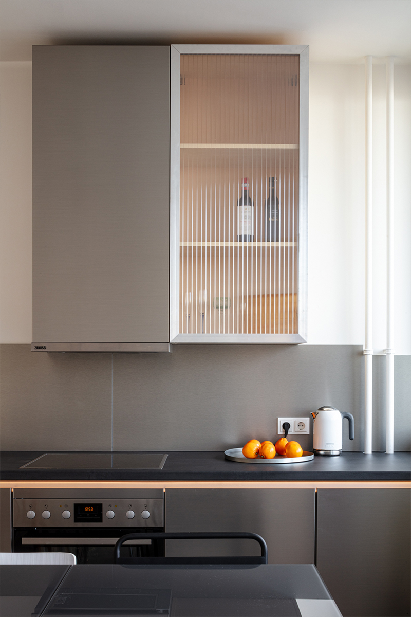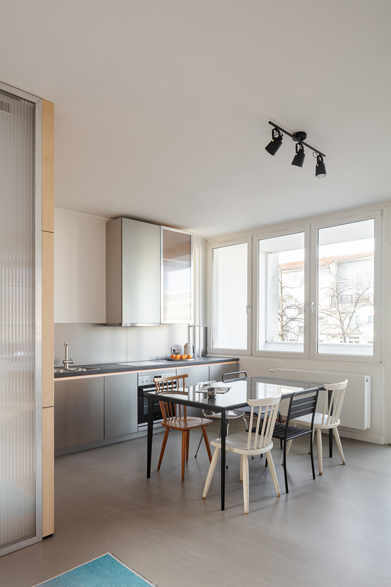 The existing apartment of 70m2 consisted of two bedrooms, a closed kitchen and a small living room, as well as about 15m2 for circulation. The main challenge of this project was programmatic: how to transform a 2-bedroom apartment in a 3 bedrooms + 1 office apartment.