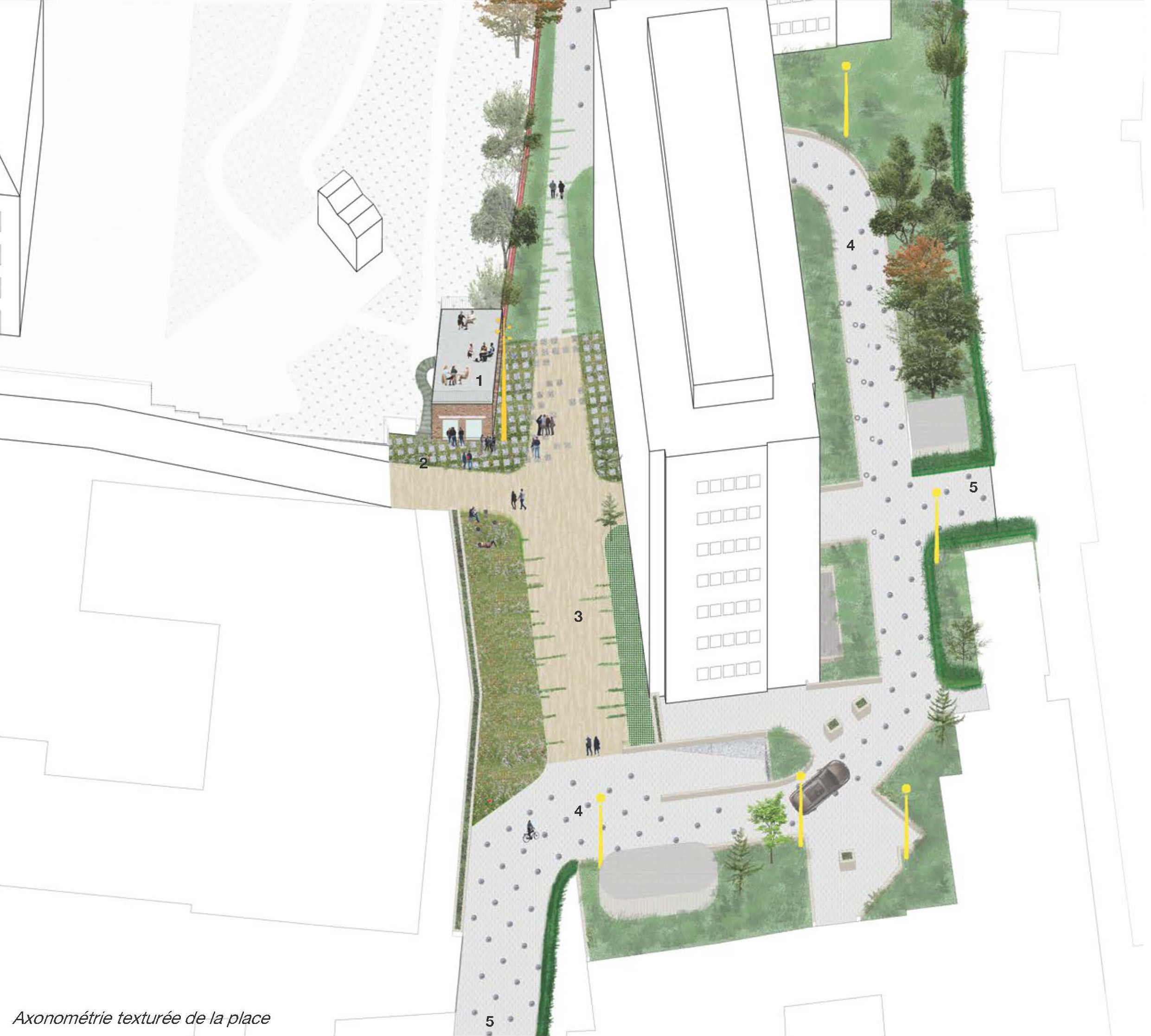 : Public SpaceThe public space strategy for the Jacquet Quarter focuses on inclusivity, accessibility, and a strong vegetal identity, structured around a series of interconnected parvis, squares, and green corridors. At the core, the new parvis of École «La Famille» resolves existing level differences to provide fully accessible entries and inclusive programmed seating and play areas, while integrating secure planted zones and service access. Similarly, the Victoria Park extension reopens and clarifies the park’s boundaries, removing visual obstacles to enhance safety, creating legible access points from streets and public transport, and reinforcing pedestrian and cyclist connections. The project introduces new amenities such as non-gendered restrooms, drinking fountains, and bicycle parking, combined with lighting and signage strategies to strengthen the public realm’s legibility and comfort.