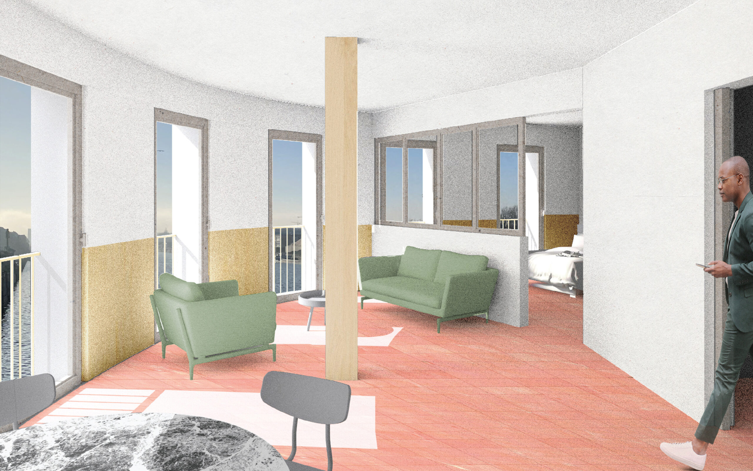 In this context, the new five-unit corner building will benefit from stronger connections to the canal, direct links with the redevelopment of the Monument to Labour Park and Jules De Trooz Park, and the creation of new pedestrian and cycling paths along the water. Above all, the project aligns with the ambition to drastically reduce road traffic in favor of prioritizing metropolitan routes on the canal’s right bank while dedicating the left bank to local streets designed for soft mobility and public transport.